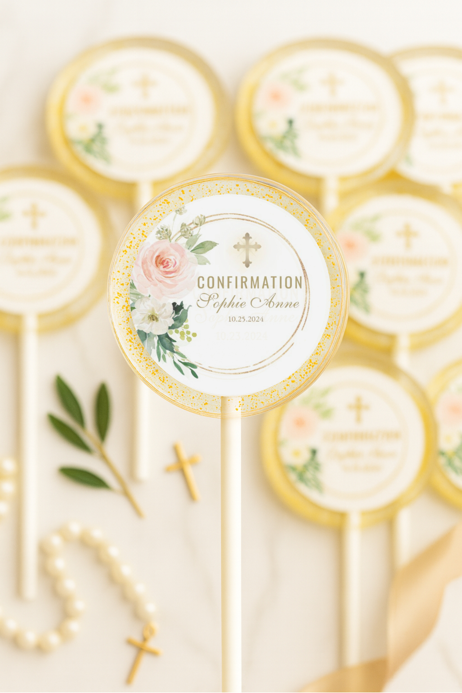 Elevate your shelves with crystal-clear Confirmation Lollipops that sparkle with subtle gold and soft watercolor florals. Premium isomalt gives a true glass-like look so the cross and artwork appear suspended perfect for gift shops, florists, hotels, party stores, churches, and event planners.