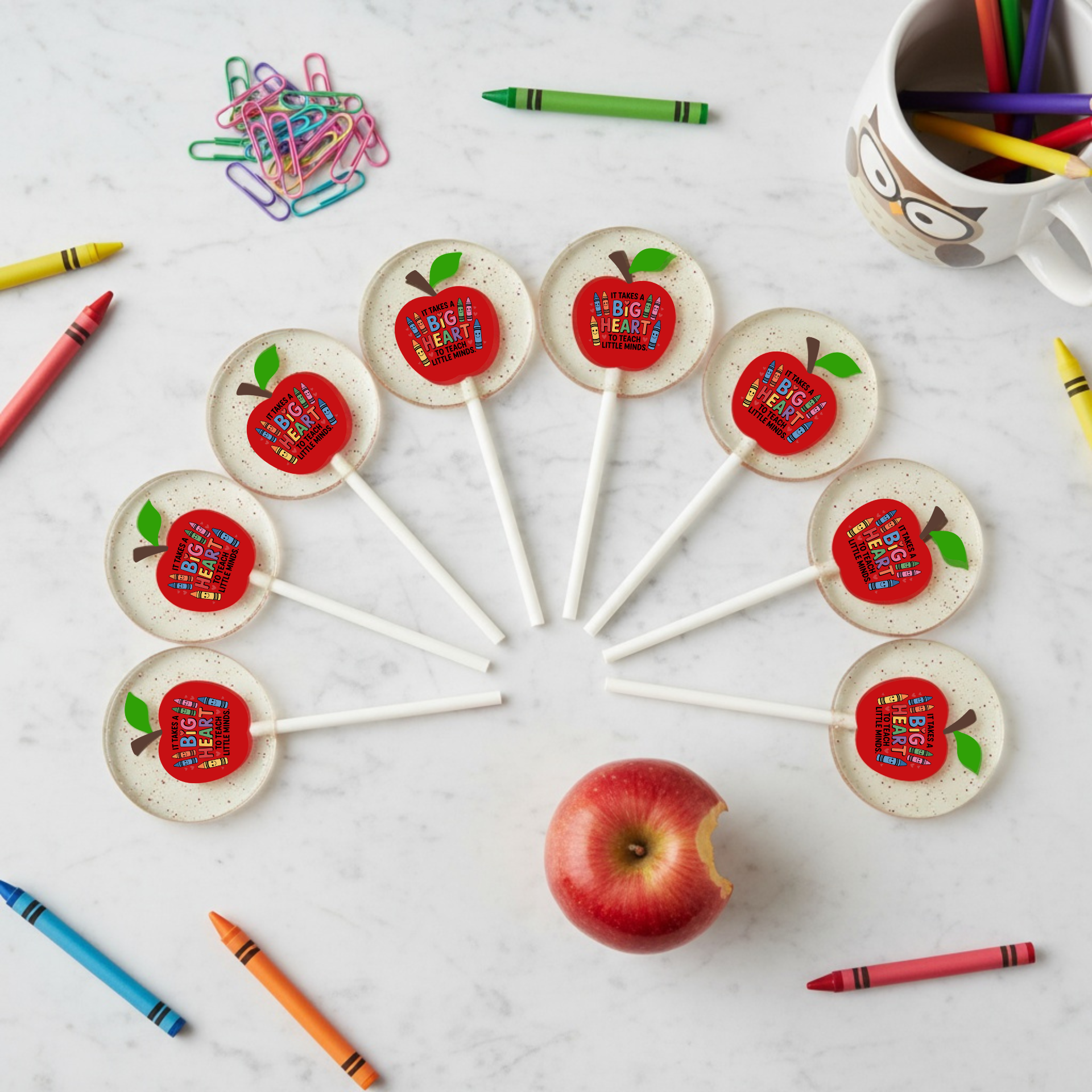 From Teacher Appreciation Week to education fairs and classroom welcome kits, these Teacher Appreciation Lollipops deliver smiles and easy gifting. Each crystal-clear isomalt pop features a red apple topper with the message “It Takes a Big Heart to Teach Little Minds” and a soft scatter of edible glitter. Perfect for PTO events, staff lounges, front-desk giveaways, open houses, and school conventions.