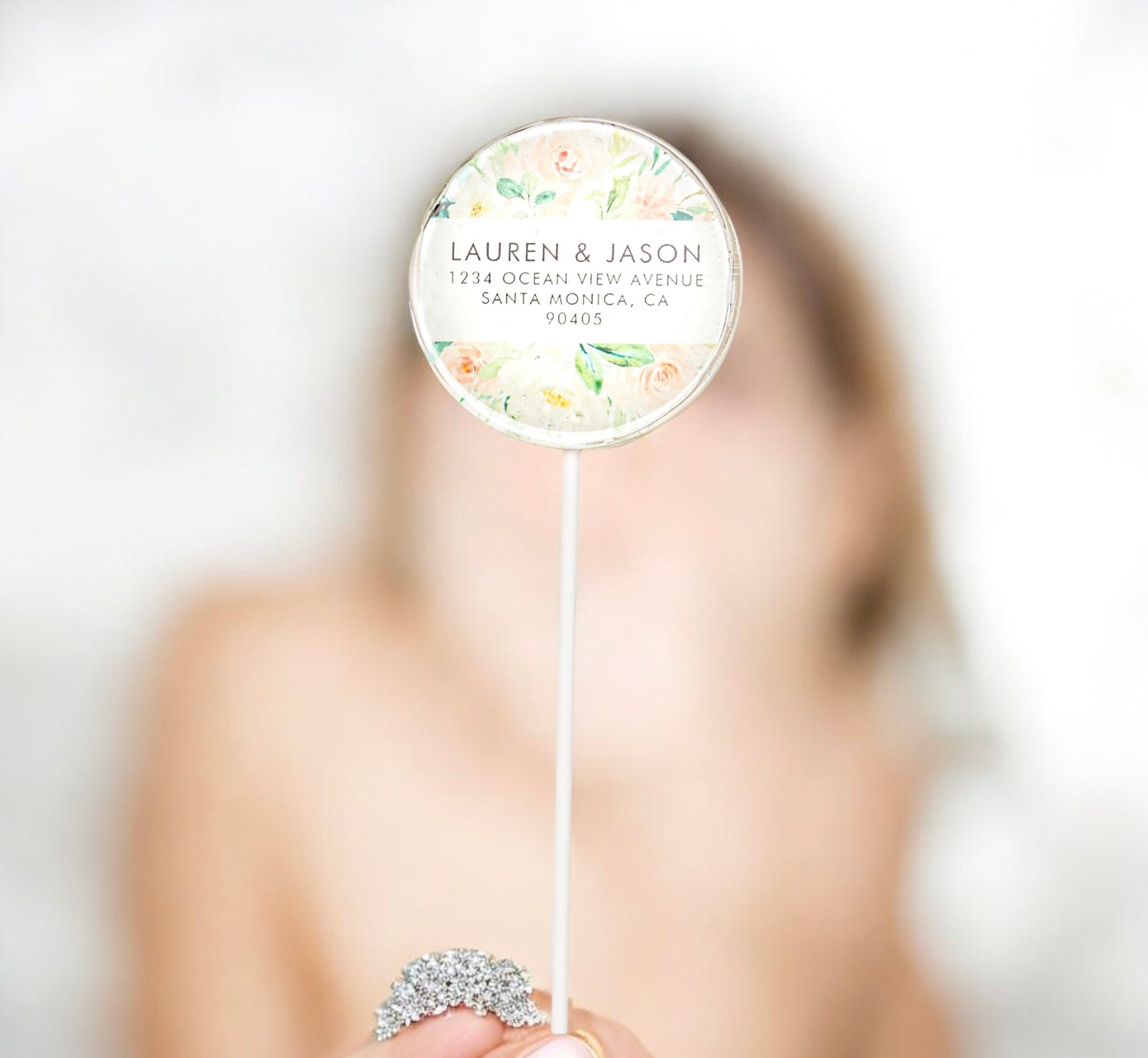 But that’s not all! We can also embed your wedding details inside the lollipop, just like a traditional invitation, for an extra touch of personalization and surprise. Perfect as a creative invitation or elegant favor, these lollipops combine flavor and charm to make your announcement truly memorable.